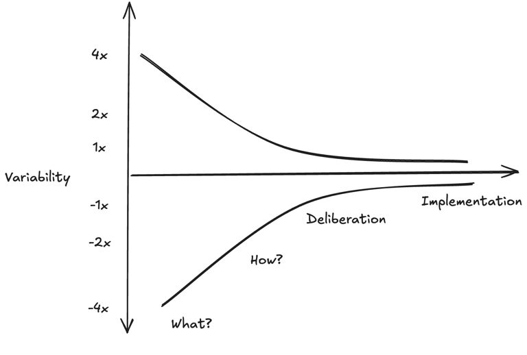 Trying to be predictable regarding estimations in software engineering is almost always tricky. There is a reason why they are called estimations. There will always be some level of ambiguity, and the more ambiguity present, the greater the chances that the team misjudges the time and resources needed for the project. As depicted in the diagram above, the cone of uncertainty tends to expand exponentially at the early stages of project development, particularly when clarity about the "What" is lacking. Essentially, this refers to understanding exactly what the team is trying to build or deliver. In a startup environment, this ambiguity is even more pronounced due to the exploration and discovery phases that are inherent to product maturation.